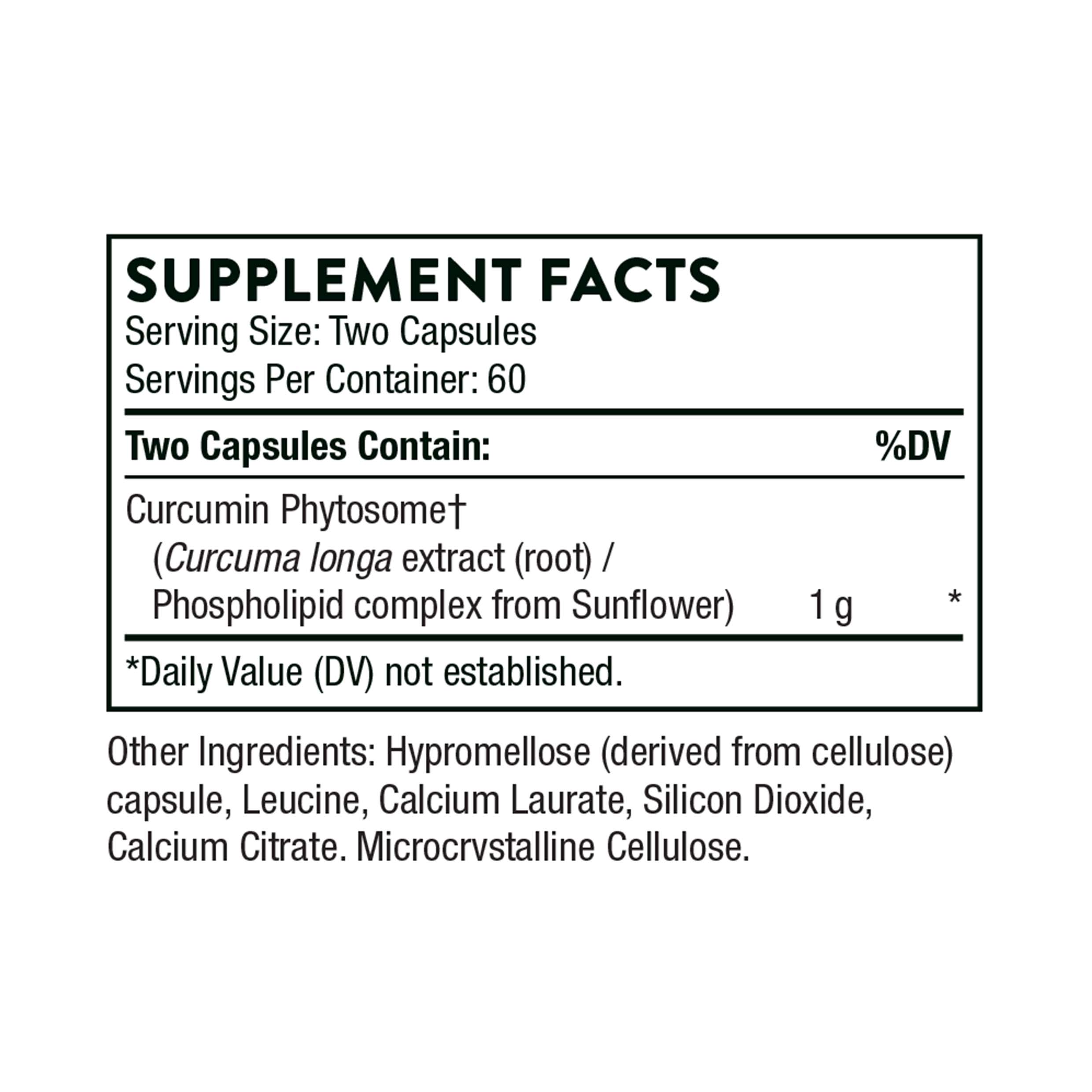 Ingredients | Curcumin Phytosome (Meriva) 1g. Other Ingredients: Calcium (Citrate), Calcium Laurate, Hypromellose Capsule, Leucine, Microcrystalline Cellulose, Silicon Dioxide |