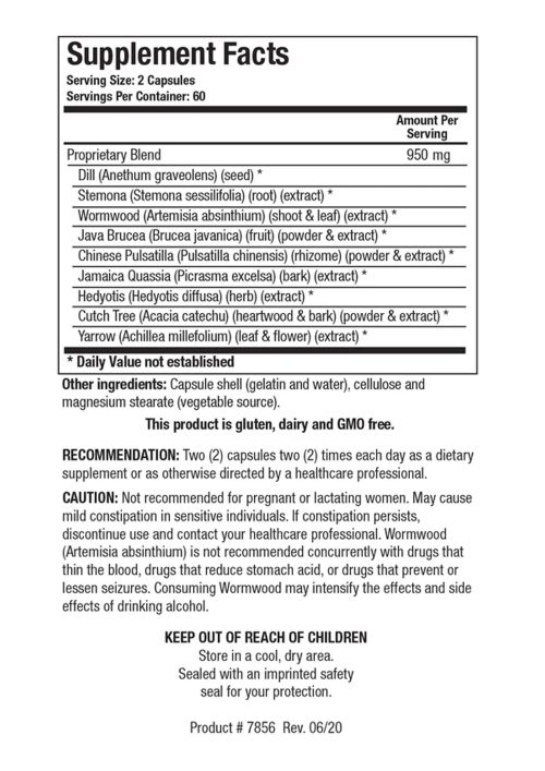 Ingredients | Dill, Stemona, Wormwood, Java Bruce, Chinese Pulsatilla, Jamaica Quassia, Hedyotics, Cutch Tree, Yarrow. Other Ingredients: Capsule shell (gelatin and water), Cellulose and Magnesium Stearate (vegetable source). |