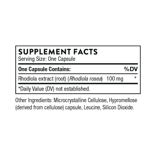 Ingredients | Rhodiola extract (root) (Rhodiola rosea), Microcrystalline Cellulose, Hypromellose (derived from cellulose) capsule, Leucine, Silicon Dioxide. |