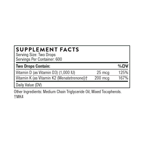 IngredientsVitamin D (as Vitamin D3), Vitamin K (as Vitamin K2 (Menatetrenone)), Medium Chain Triglyceride Oil, Mixed Tocopherols.